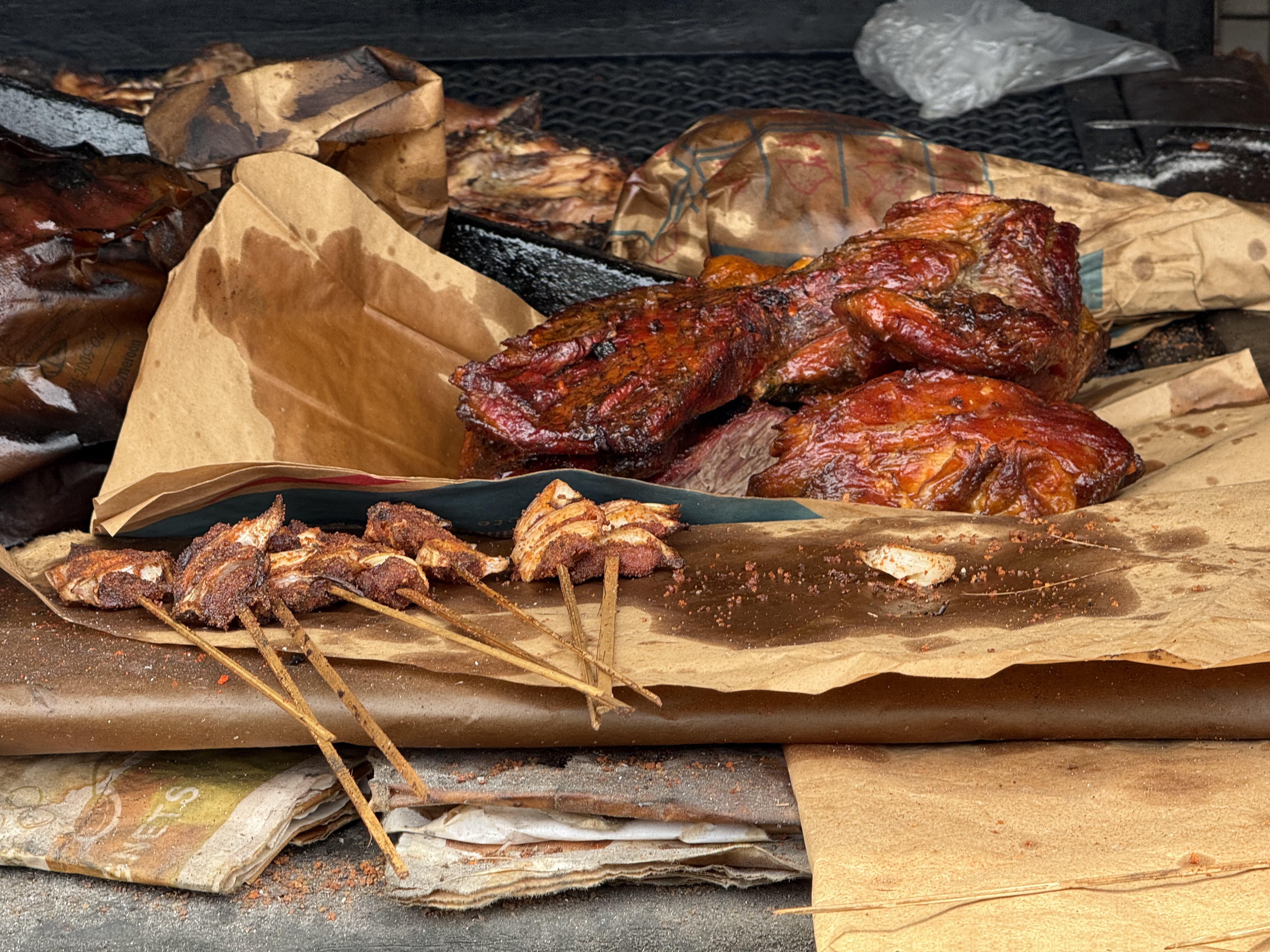 Possibly the most famous Cameroonian street-food, and definitely the tastiest, porc grillé is Cameroon’s go-to for parties, weddings, and football match gatherings. Pork shoulder or ribs are cubed, marinated in a fiery blend of ginger-garlic paste, njangsa (a nutty African seed), African nutmeg (ehuru), bouillon cubes, and Scotch bonnet peppers, then skewered and charred over open coals. The result is crispy, smoky, and juicy, with a spicy umami kick. Often paired with fried plantains and a cold beer, it’s a crowd-pleaser in Douala’s bustling markets.