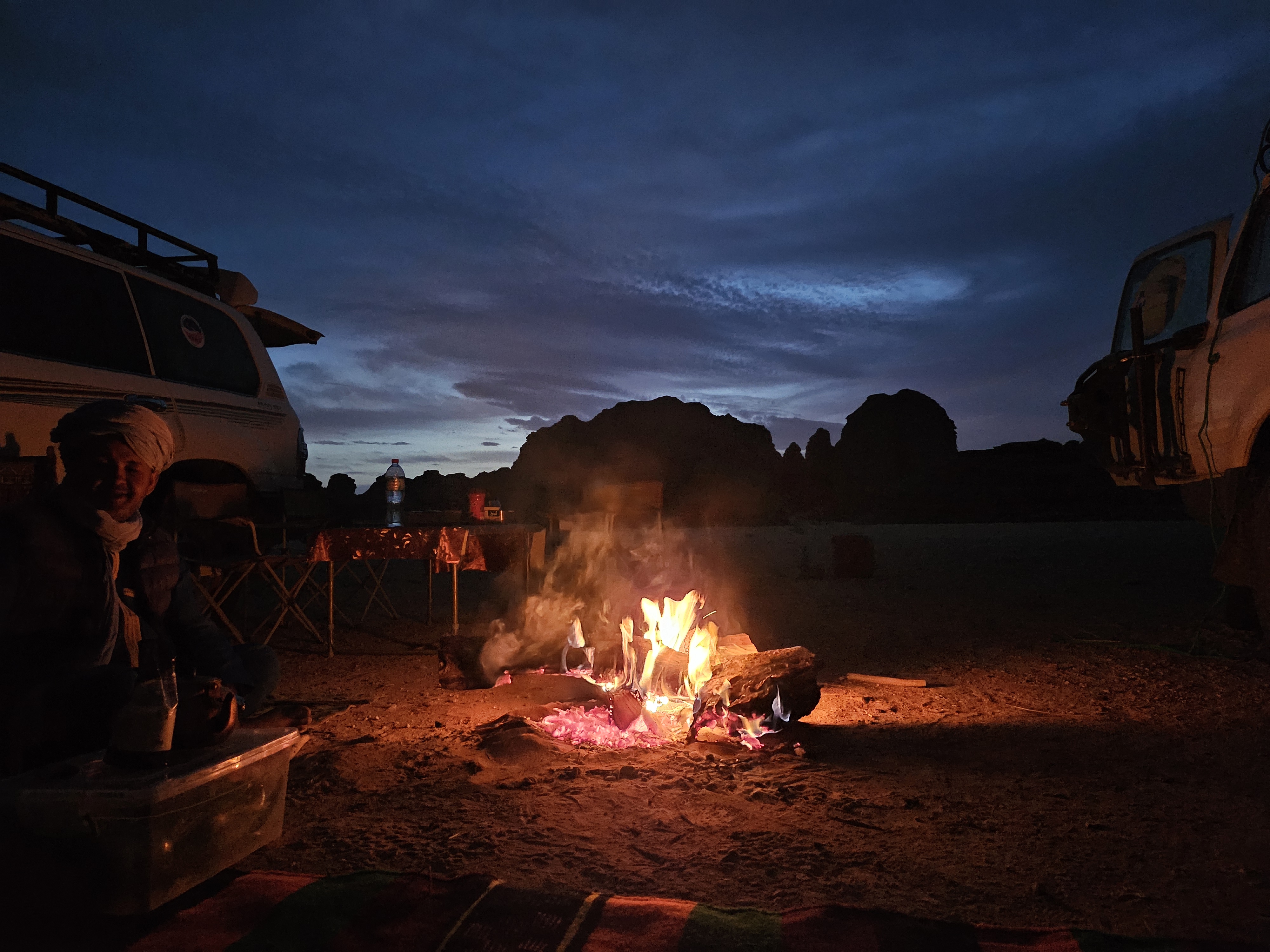 We will provide everything you need for a comfortable night’s sleep. Anything else you bring is up to your preference. Sometimes people bring headlamps or flashlights to aid with late night bathroom trips or searching for things in their pack in the tent. The desert can get cold at night. Typically, the blanket we provide is enough warmth, but you might want to be prepared with a couple extra layers of comfortable warm clothing in case the night you’re travelling is extra cold. If you’re a light sleeper, you might want to bring earplugs, in case the sound of someone getting up in the night would bother you. Because there is a shower facility at Tergit Oasis, you should bring a towel if you plan to take a shower or have a swim in the oasis. If you have an external battery charger, it could be worth bringing. There is a charging station at Tergit Oasis, and in Algeria you can charge your phone in the car during the day, but if you have your own charging system, it means you won’t need to compete with others to get your things charged.
